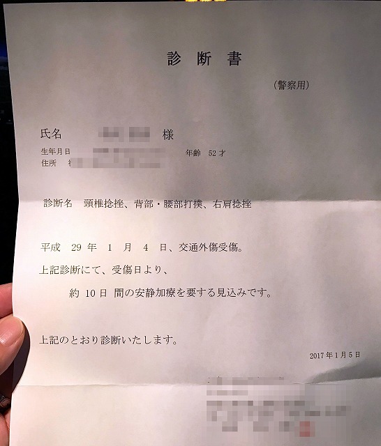 診断は頸椎捻挫・・・いわゆるムチウチ症で、全治10日間の安静加療が必要とのこと。